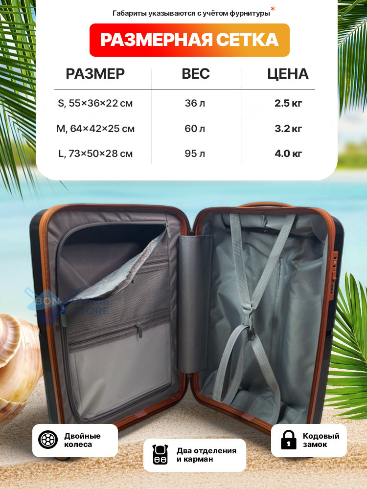 • Прочный материал: чемодан изготовлен из высококачественного полипропилена, который обеспечивает надёжность и долговечность. Он не боится царапин, ударов и влаги, что делает его идеальным выбором для частых поездок.